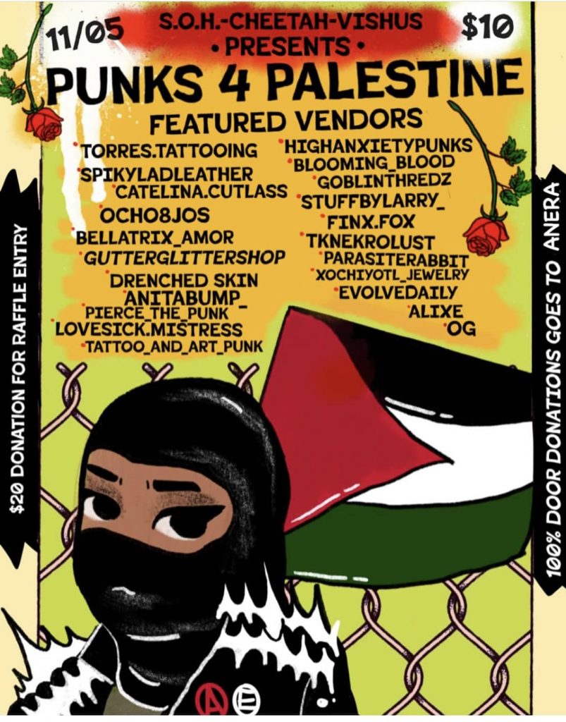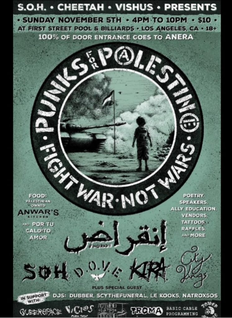 “With a heavy heart, we’re calling on the Los Angeles punk community to take a stand. Witnessing multiple war crimes committed and the day to day updates on the civilians lives lost due to the expense of battle. Kristine, Juju and Jezel are organizing a benefit to raise awareness on our attempts to cease fire, aid Palestinians refugees and children, and stop military aggression. There will be a Palestinian vocalist highlighted in the band Ingrad as well as multiple Palestinian speakers to raise awareness. Pamphlets and many other educational resources will be provided as well as our lovely vendors who will be donating as well. Anwars, a Palestinian owned restaurant will be vending. 100% of doors goes to ANERA who’s on the ground in Gaza now. This is a peaceful benefit, respect the space and Free Palestine.”
