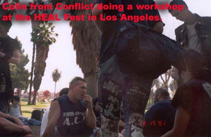 Today was the first day of the HEAL fest. Conflict arrived early and I was really excited about Colin doing one of the workshops. He told me that he and Paco would do it together. As we were walking towards the park I asked Colin to talk about the history of Conflict and all the causes they were involved with; like bust funds, opening centers, ALF arrests, etc.