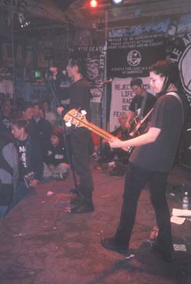 Aus Rotten did a really good set and made the crowd all crazy. I was really happy to see Edy, who used to play guitar for Autonomy. He lives in S.F. now. Ramsey from AK Press came to the event and another person named Pete the roadie from England was there too. He is long time friends with Sub Humans. Even members from Tribe 8 came to the show to see Aus Rotten and Adrian from Spit boy sang with them. One of the Gilman St people came up to me and said he'd never seen so many banners hung there before. We had tons of banners and the walls were covered with political graphics and slogans.Neil had his distro along with tons of animal rights literature....and there were videos of direct action and protests.
